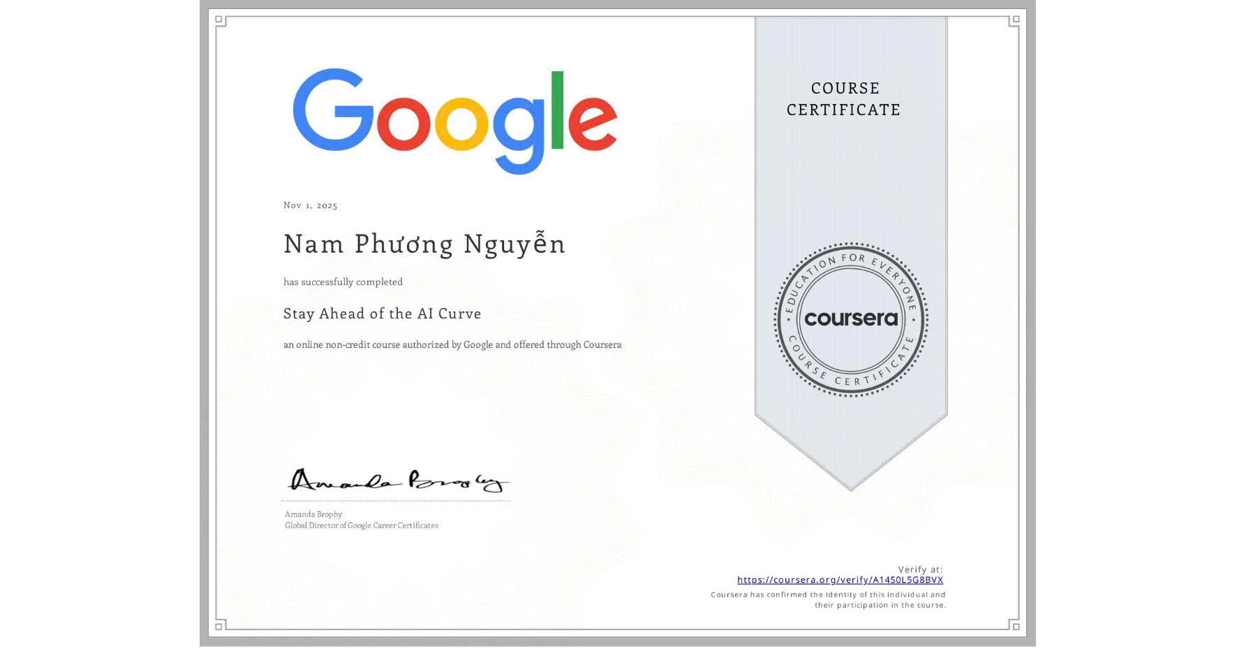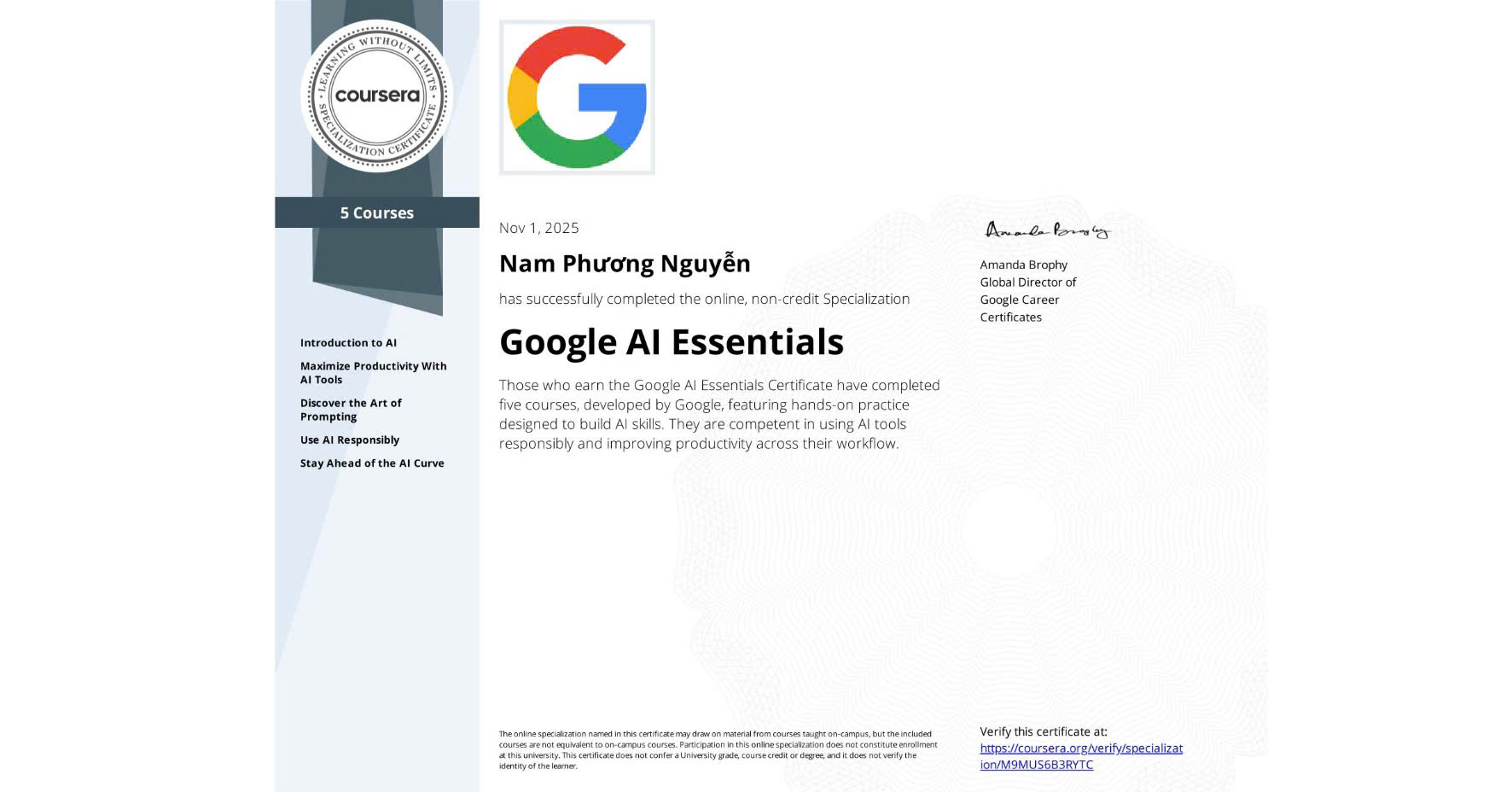 Những chứng nhận này không chỉ thể hiện tinh thần tự học và khả năng thích ứng công nghệ của Nam, mà còn là nền tảng giúp anh ứng dụng AI vào học tập, sáng tạo nội dung và phát triển bản thân. Việc hoàn thành toàn bộ khóa học là minh chứng cho sự nghiêm túc, cầu tiến và khát vọng không ngừng đổi mới của một sinh viên thế hệ số.